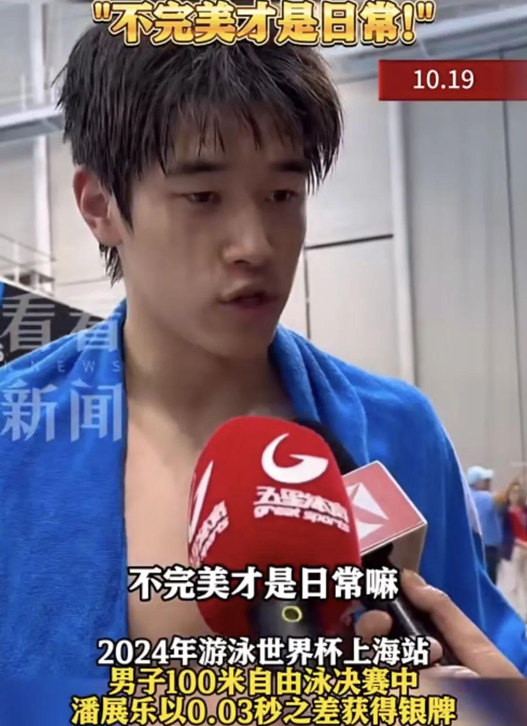 北京时间10月19日,在2024年游泳世界杯上海站男子100米自由泳决赛中,意大利选手托马斯-切孔夺得金牌,中国选手潘展乐以0.03秒之差获得银牌。赛后他接受采访时再出金句“不完美才是日常!”