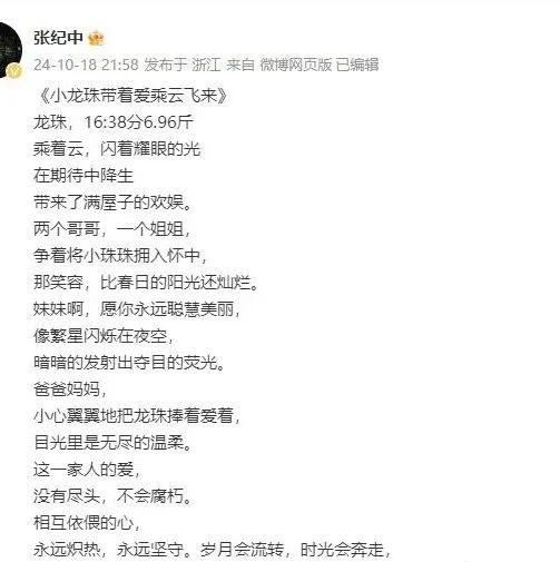 18日晚,张纪中发博宣布了小女儿降生的喜讯:“龙珠,16:38分6.96斤,乘着云,闪着耀眼的光,在期待中降生。”还晒出了夫妻俩和四个孩子的全家福合影,妻子杜星霖躺在产床上抱着小女儿,丈夫和三个孩子围在身边,画面相当温馨。