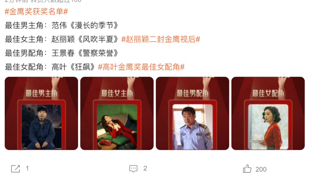第32届中国电视金鹰奖的最佳男主角由范伟凭借《漫长的季节》获得,最佳女主角则由赵丽颖凭《风吹半夏》拿下。王景春因在《警察荣誉》中的表现荣获最佳男配角,而高叶则因为《狂飙》获得了最佳女配角奖项。最佳电视剧导演奖被杨磊摘得,《三体》是他执导的作品。秦雯凭借《繁花》赢得了最佳电视剧编剧奖。何炅主持的《声生不息·宝岛季》不仅让他夺得了最佳电视节目主持人奖,还同时获得了最佳电视综艺(文艺)节目奖。