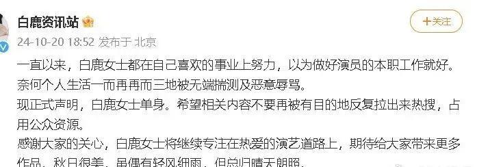 20日,刘大锤曝白鹿张凌赫曾同居引发热议。对此,白鹿资讯站发声回应,称无奈“个人生活一而再再而三地被无端揣测及恶意辱骂”:“现正式声明,白鹿女士单身。”