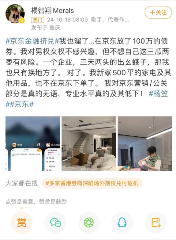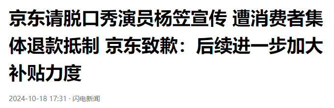 参考信源:闪电新闻 2024-10-18 京东请脱口秀演员杨笠宣传 遭消费者集体退款抵制 京东致歉:后续进一步加大补贴力度