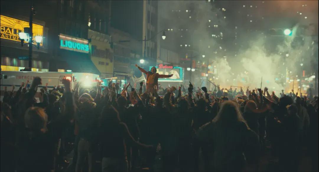 电影的最后,亚瑟顶着一张大花脸,彻底蜕变成“小丑”,站在广场上接受万千拥趸的集体膜拜。