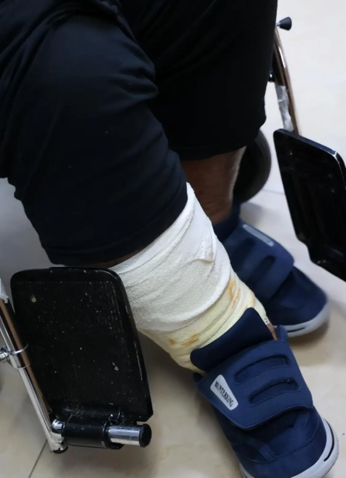 因为他的腿伤较为严重,行走不便的他只能靠坐轮椅出行,并且要长时间的穿着尿不湿。