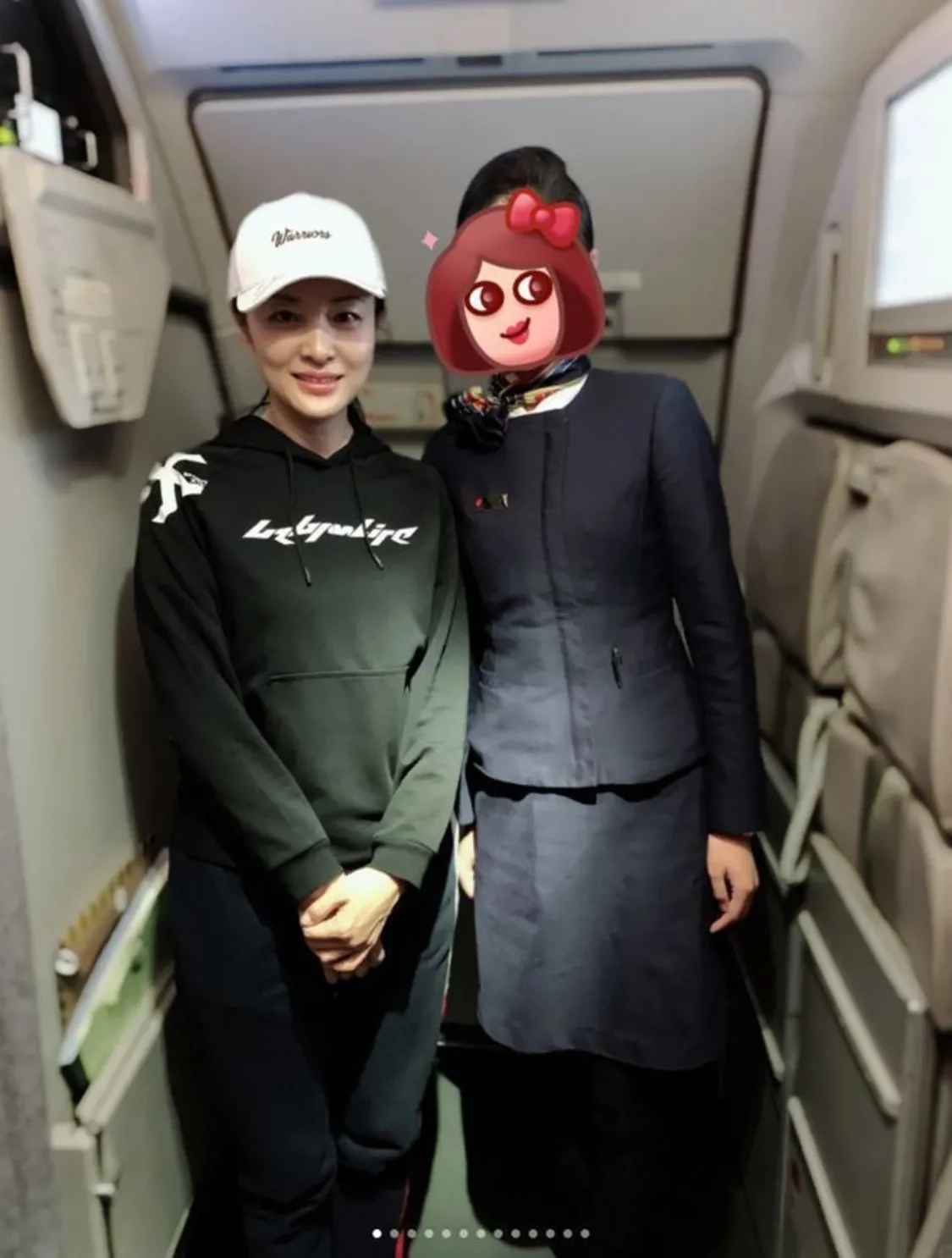 周涛在机上和空姐合影,素颜皮肤状态真能打。衣着十分低调,以舒适为主!