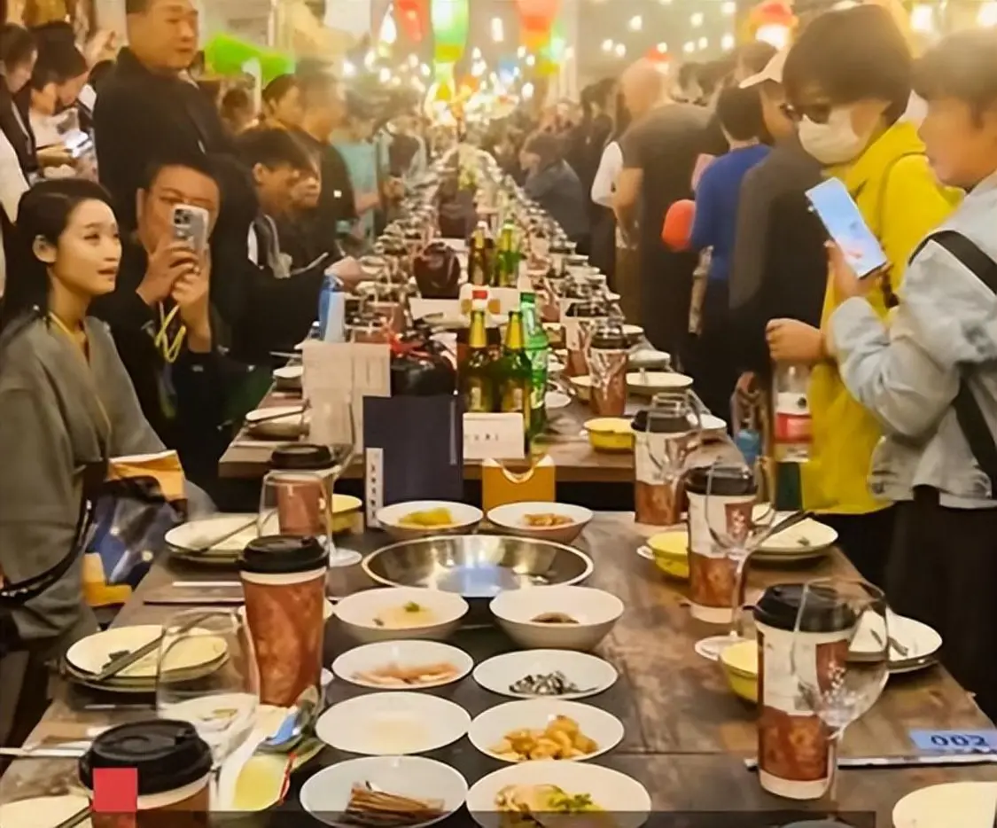 在戏剧节开始之前,乌镇举办了一场盛大的宴席“长街宴”,从现场画面中大家可以看到,诸多明星路人围坐在桌子两旁大块朵颐,那模样像极了人们在农村吃席时的样子,真的好接地气。