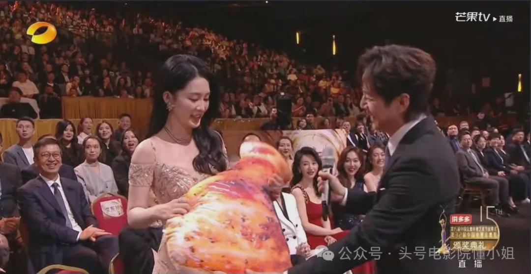 比如,主持人何炅现场给获得女演员提名的几位发礼物,有给赵丽颖的裁纸刀,给吴越的公文包,给李沁的鸡腿,只可惜,“包你得奖”这个谐音,最后没有变成现实。