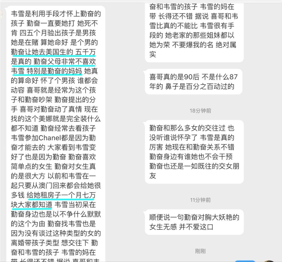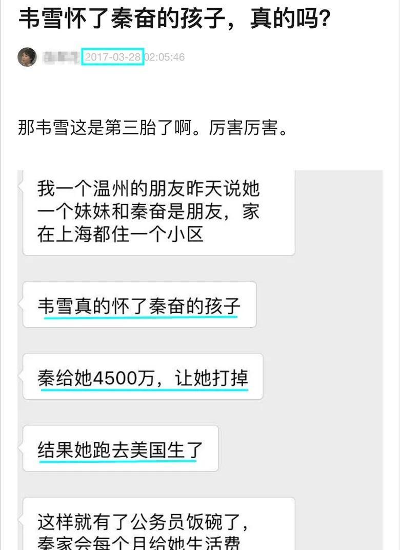 这之后相关的消息越来越多,还有人声称因为怀了孕,男方谈过要给她4500万作为打掉的赔偿,但韦雪没要,而是跑到美国去生产了。