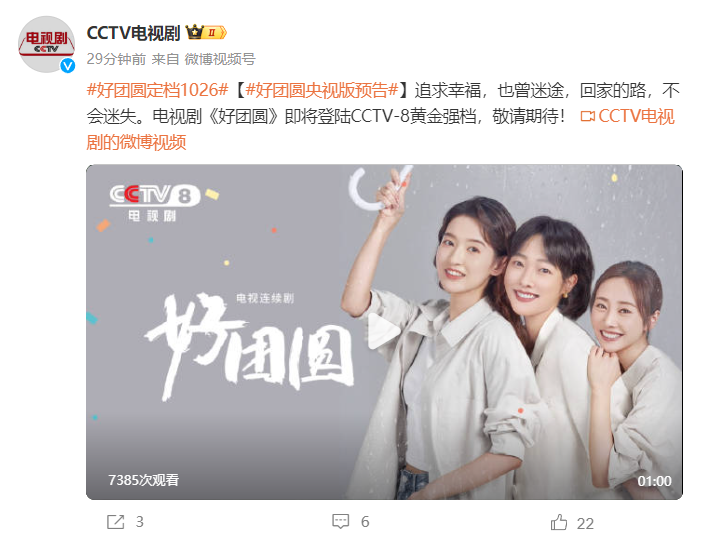 10月26日,也就是明天,36集现实主义题材剧集《好团圆》,就将登陆央视八套的黄金档。