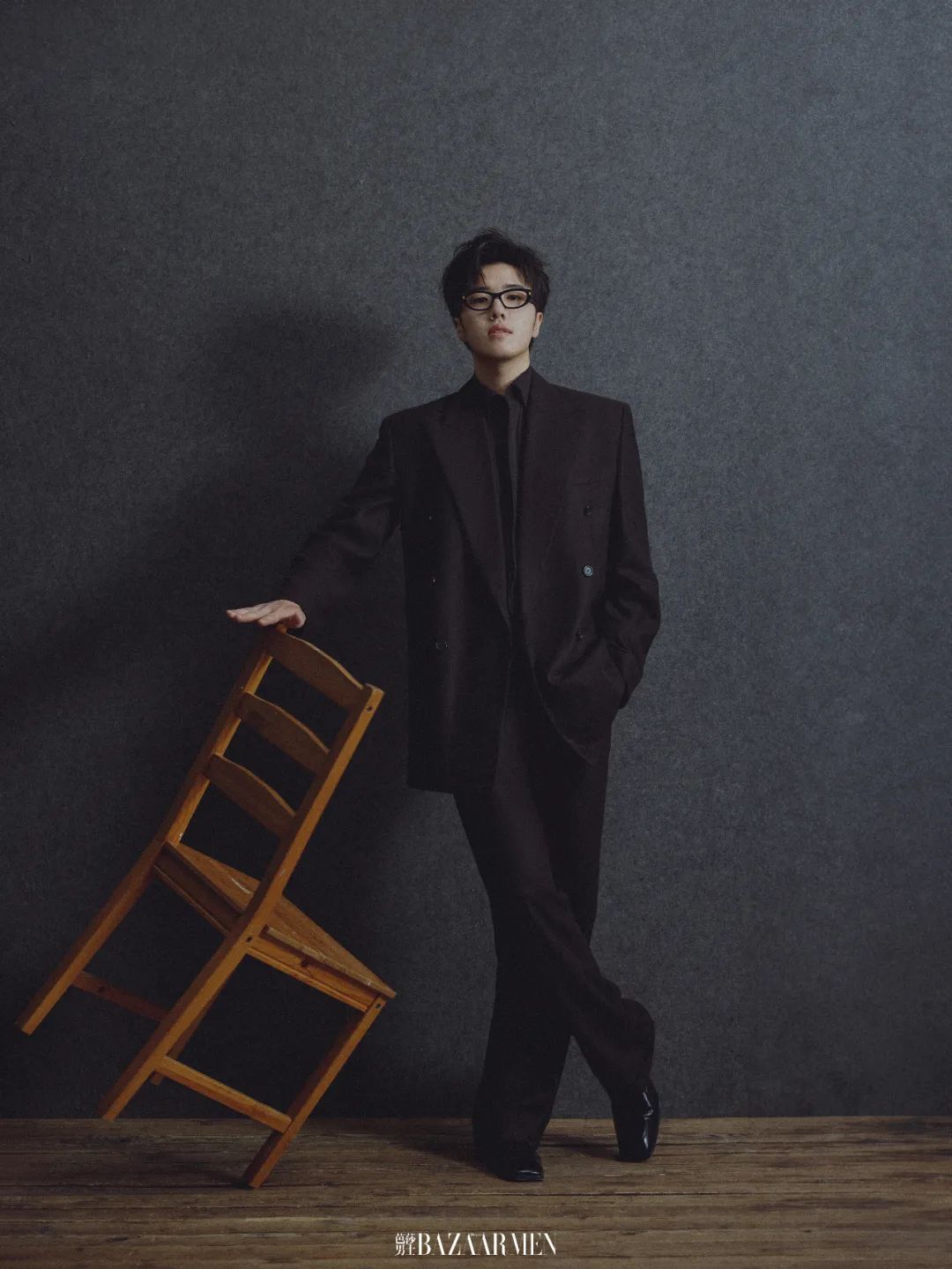 廓形西装套装、黑色皮鞋均来自于:SAINT LAURENT