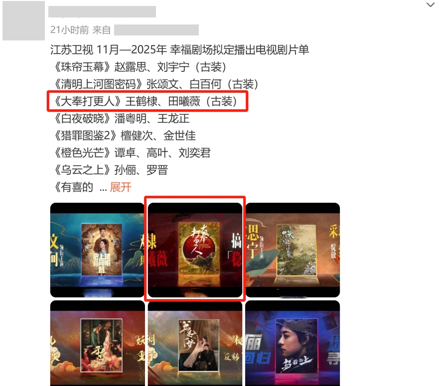 在江苏卫视最新发布的2024年11月到2025年幸福剧场拟定播出的电视剧片单中,《大奉打更人》的名字赫然在列。