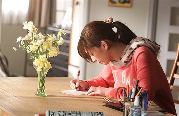 这场戏是这样写的。结夏一改以往邋遢的习惯,把家里收拾的干干净净,去超市买了很多食材,还在街边买了一束花,回到家,不擅长做饭总是搞砸的结夏用心做好了丰盛的汉堡肉晚餐。然后她坐在桌子前,开始写一封给光生的信。信写得又长又感人。