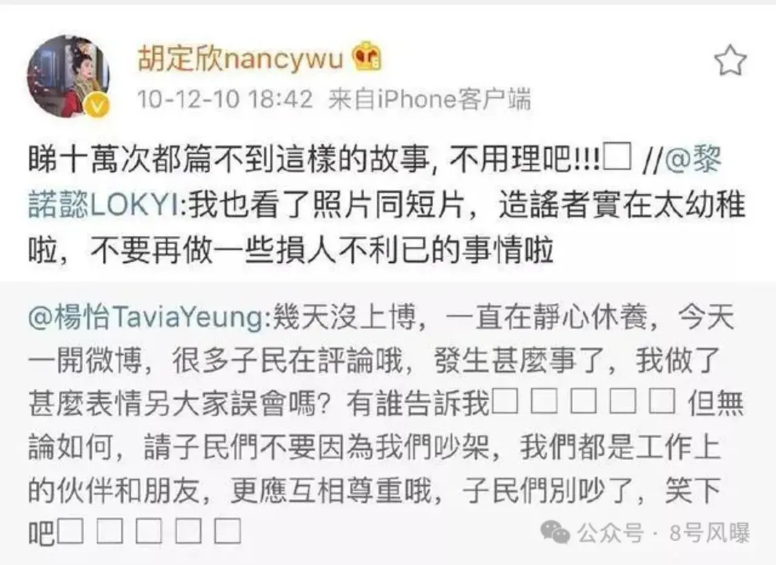 网传两人的关系后来交恶,是因为杨茜尧和胡定欣都与好友男一号吴卓羲传出了绯闻,有媒体报道,她们还当着媒体面前直接争起吴卓羲。