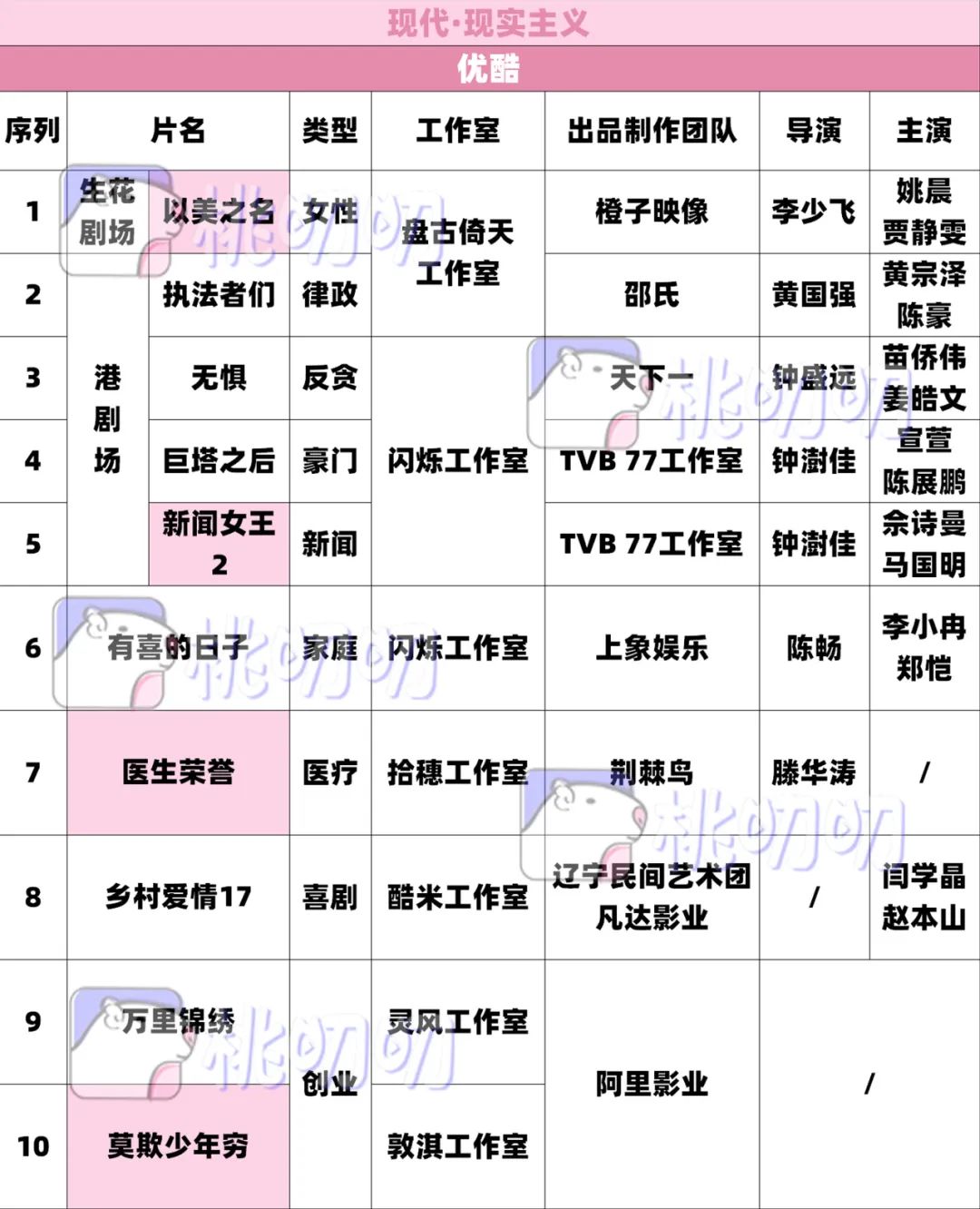 相比起来,优酷的现实主义题材数量不那么多,且其中有好几部都是港剧场,佘诗曼的《新闻女王2》最受关注。此外,姚晨和贾静雯合作的整形行业剧《以美之名》,有题材优势。