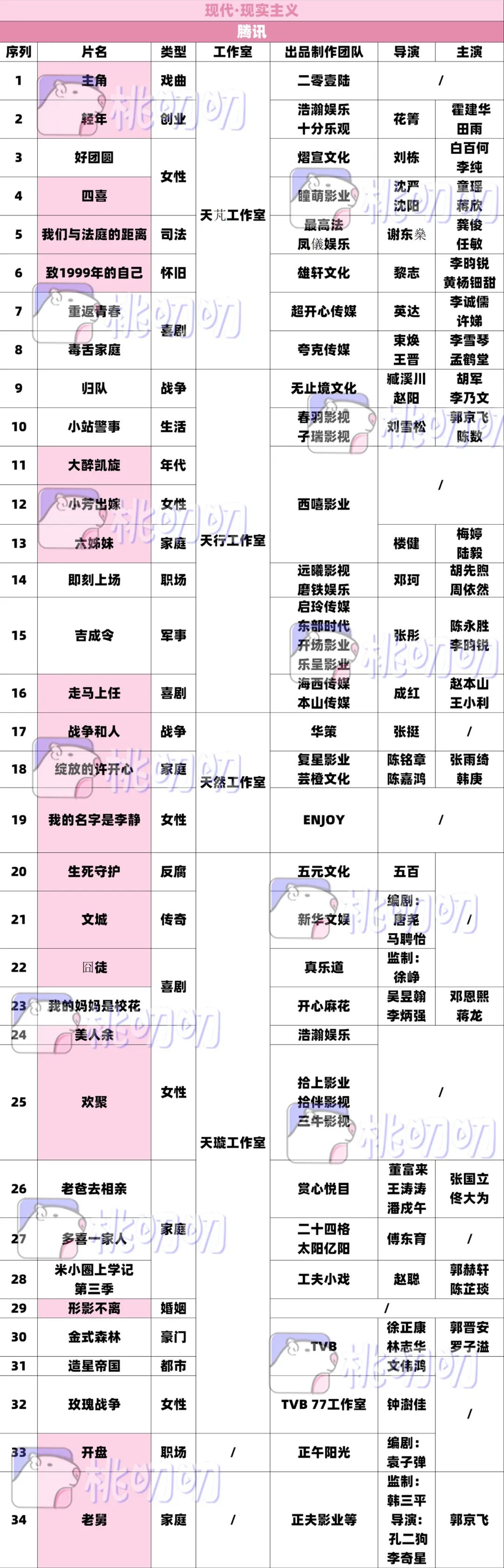 腾讯现实主义题材布局了34部,其次是25部都市爱情剧。