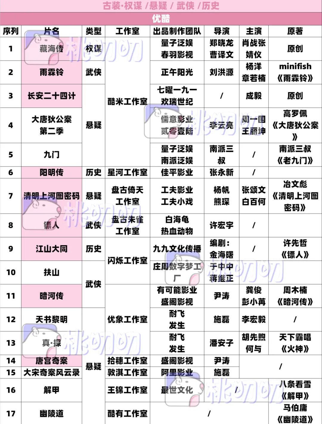 优酷除了《藏海传》《雨霖铃》《阳明传》《清明上河图密码》《暗河传》,还有成毅主演的《长安二十四计》,大IP《镖人》,于正口中“绝好剧本”的《唐宫奇案》,以及和最世文化合作的《解甲》(郭敬明从导演变成监制),都是冲着大爆去的。