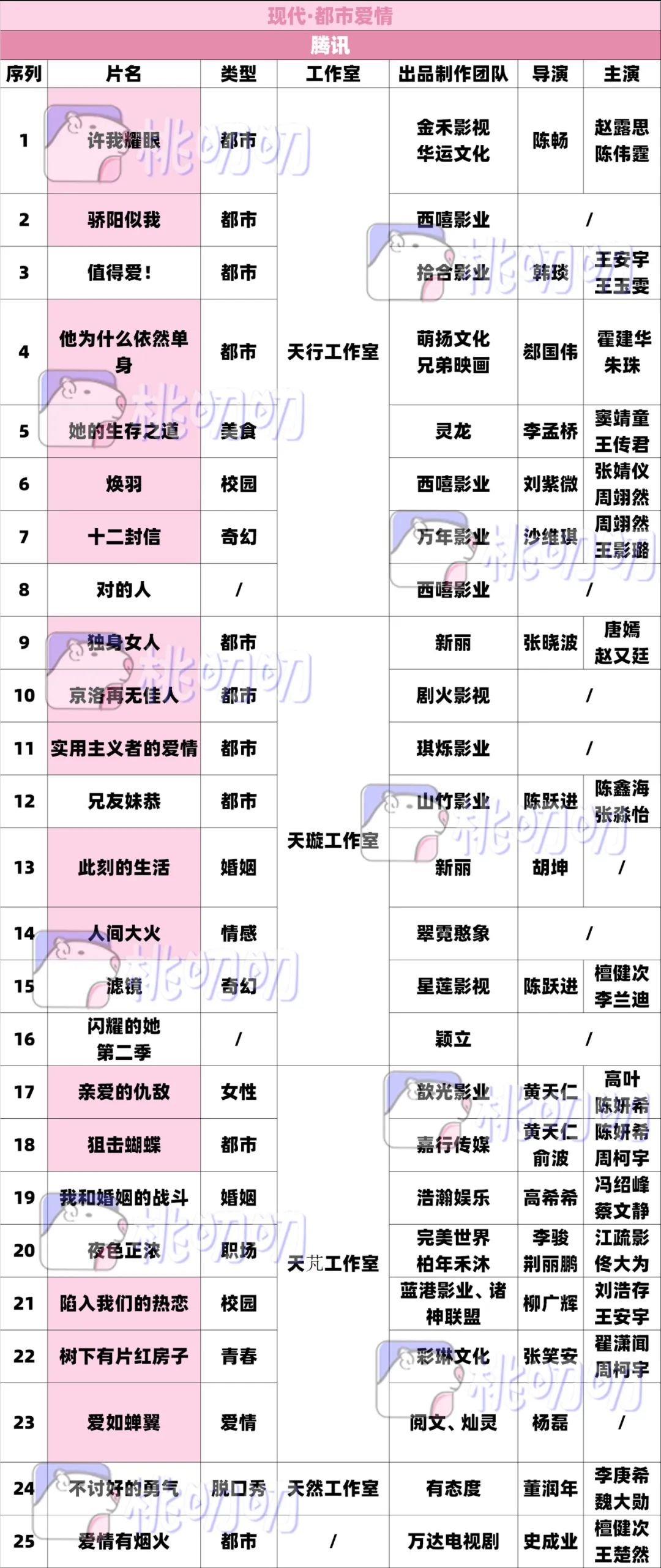 腾讯在都市爱情剧上一向有“江湖地位”,25部片子涵盖都市青年男女情感的方方面面,既有阳春白雪也有人间烟火。