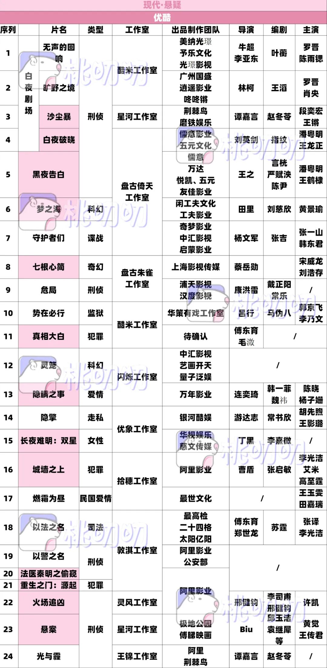 优酷同样是一半悬疑,剩下现实主义和爱情平分,悬疑剧有24部。