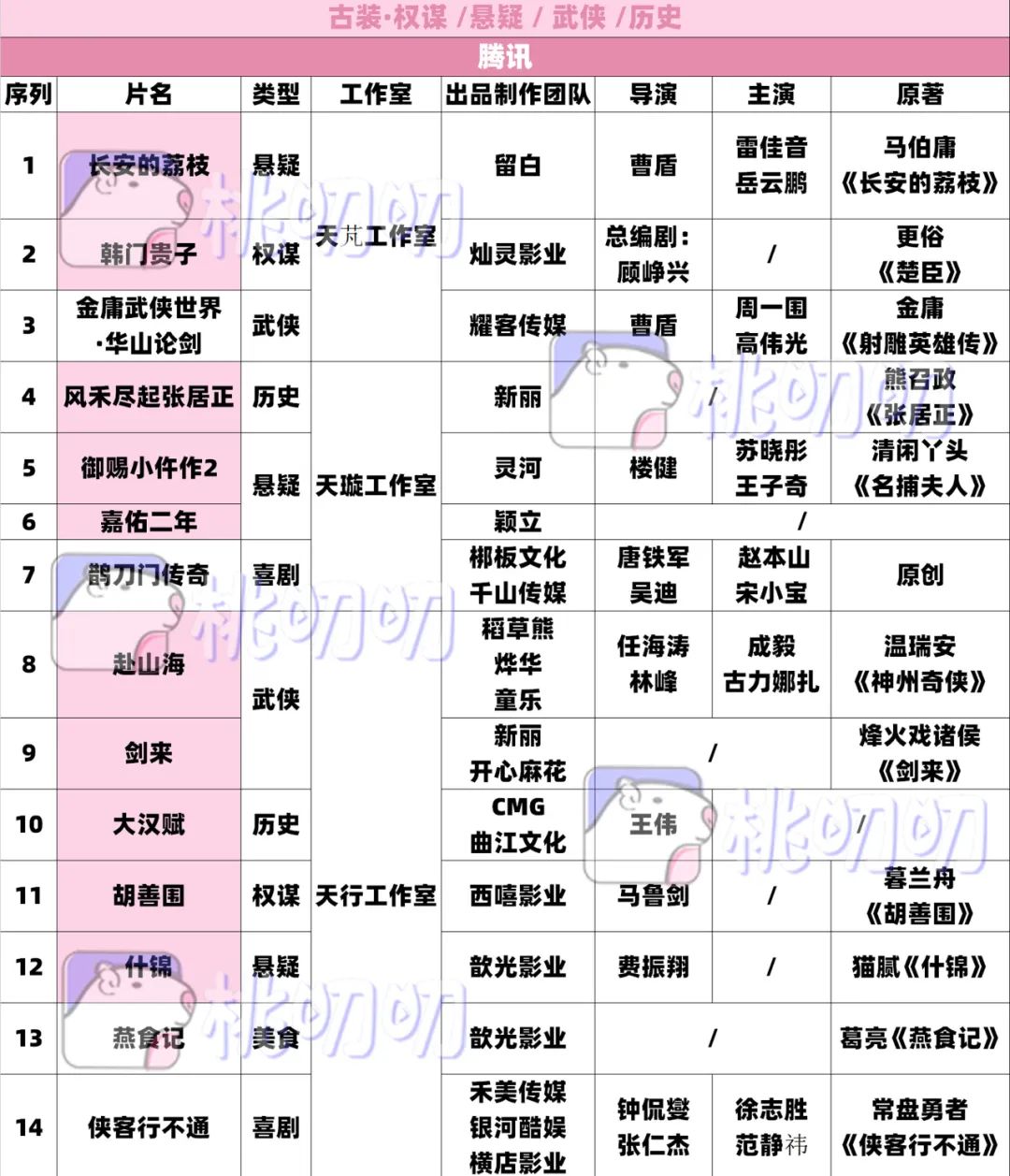 腾讯除了《长安的荔枝》《风禾尽起张居正》《御赐小仵作2》《剑来》之外,原名《楚臣》的大男主剧《韩门贵子》,一网打尽苏轼,苏辙,曾巩,张载等大文人的《嘉佑二年》,猫腻原著的《什锦》,和唯一一个讲女权臣的《胡善围》可以关注一下。