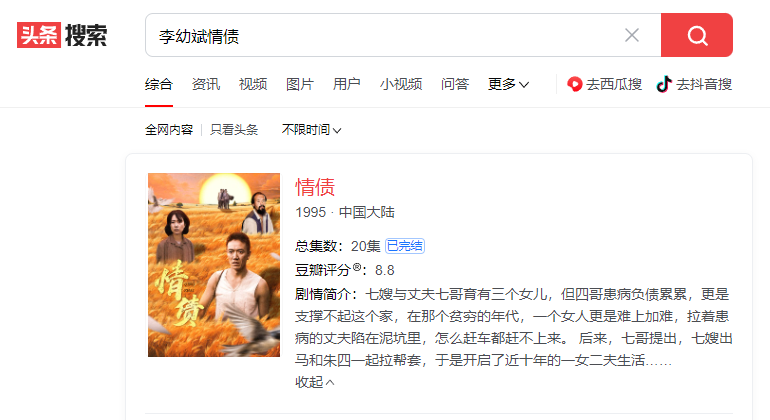 很多人因为李幼斌的《亮剑》太出名,就以为他只适合演军人,实际上他早些年的农村剧演得也相当不错,比如这部1995年播出的《情债》。
