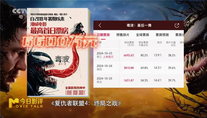 毒液超高人气在上映首日就收获超6600万元票房,创下了2019年《复仇者联盟》谢幕以来超英电影单日票房纪录,上映两天票房破亿。